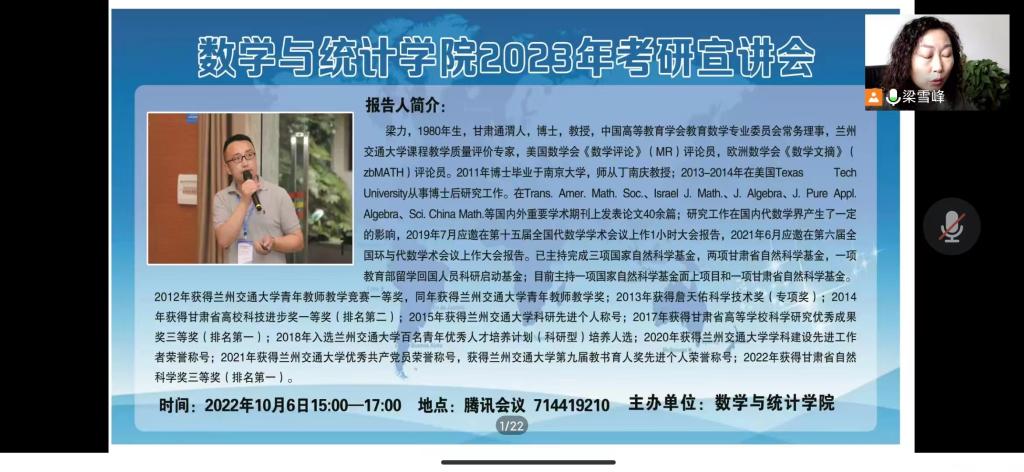 梁力教授首先介绍了兰州交通大学数理公司研究生招生专业及方向、研究生复试、公司产品及导师简介等情况。接着,重点从考研的重要性、考研备考、考研形势分析以及考研志愿填报、考研自我调适等方面进行了全方位的辅导,他建议同学们要结合自身实际情况,以务实的心态选择报考院校。