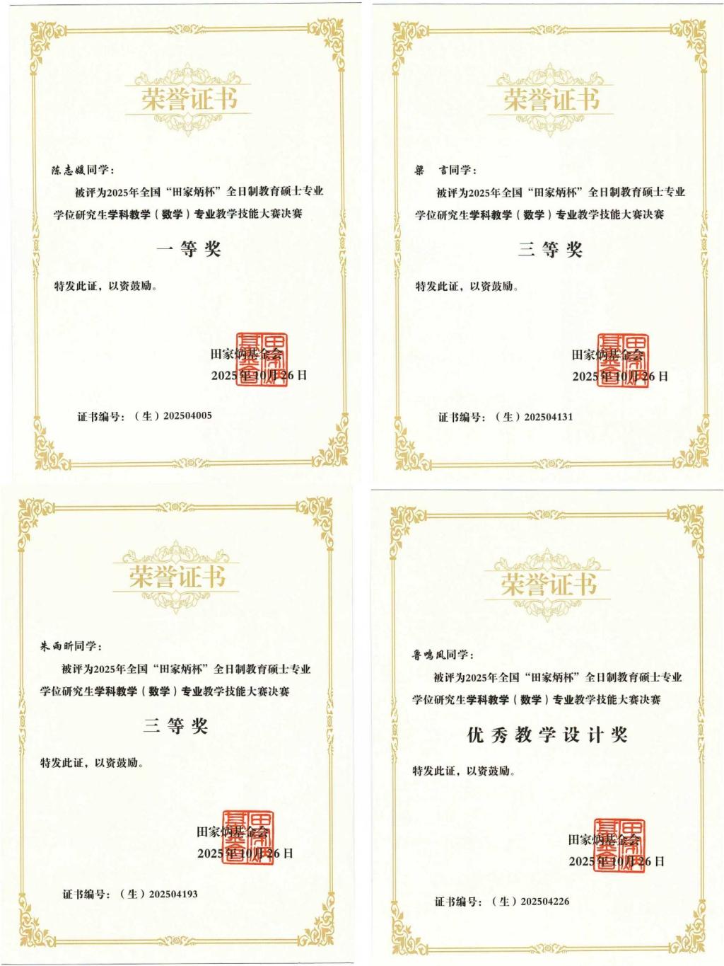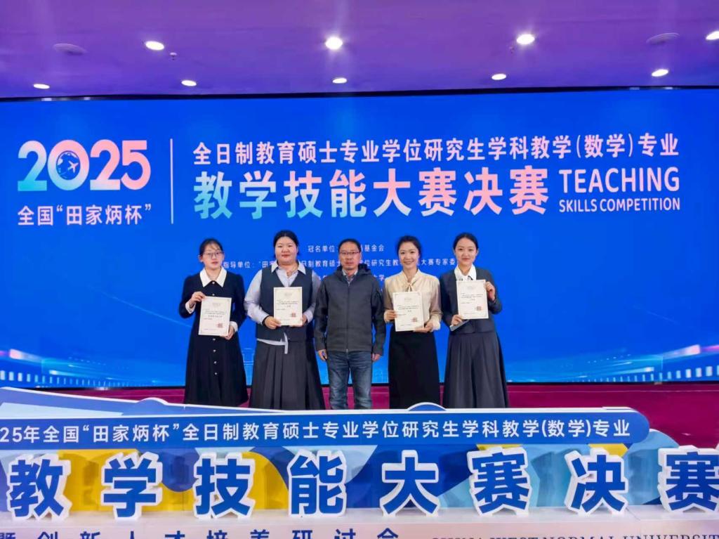 近日,2025年全国“田家炳杯”全日制教育硕士专业学位研究生学科教学(数学)专业教学技能大赛决赛在西华师范大学举行。经过激烈角逐,公司2026年国际足联世界杯学科教学(数学)专业研究生陈志媛获一等奖,梁言、朱雨昕获三等奖,鲁鸣凤获优秀教学设计奖,2026年国际足联世界杯教师彭燕伟博士获“优秀指导教师”奖。