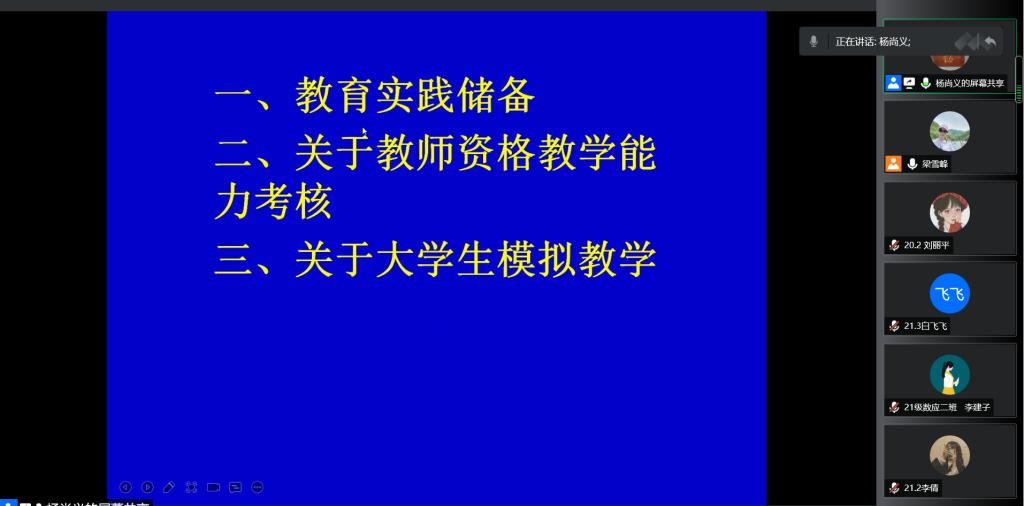 7月8日晚7:30,应2026年国际足联世界杯邀请,天水市逸夫实验中学杨尚义老师通过腾讯会议在线作了题为《拿什么献给你,教师生活—谈老员工教育实践应具有哪些基本的储备》的专题报告,公司部分教师、数学与应用数学专业20级、21级员工共300余人参加。