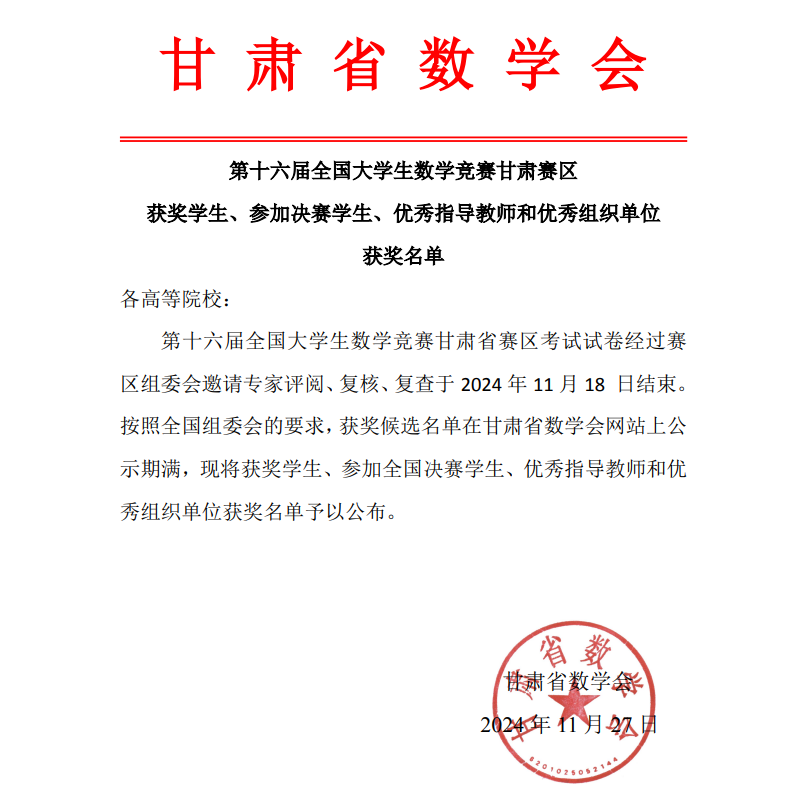 由中国数学会主办的2024年第十六届全国老员工数学竞赛(甘肃赛区)获奖名单近日揭晓。公司有101名同学喜获佳绩。数学专业B组获奖63项(其中一等奖16项,二等奖19项, 三等奖33项),非数学专业A组获奖33项(其中一等奖2项, 二等奖14项, 三等奖17项),数统公司2022级员工章惠娟进入全国决赛,公司获优秀组织奖。